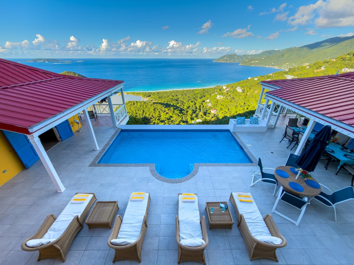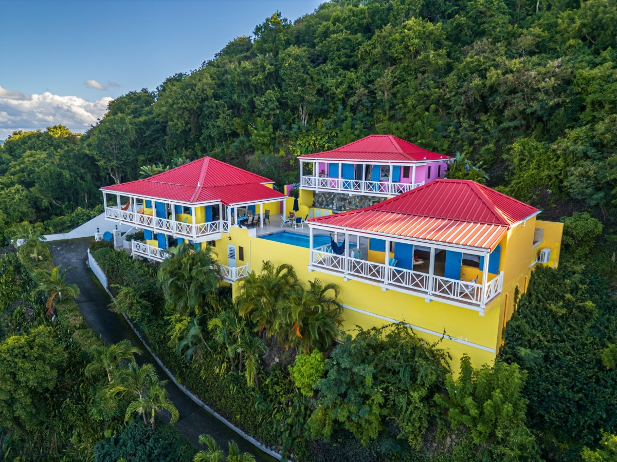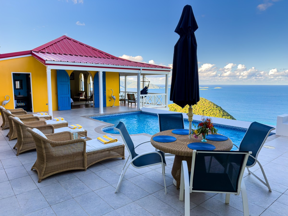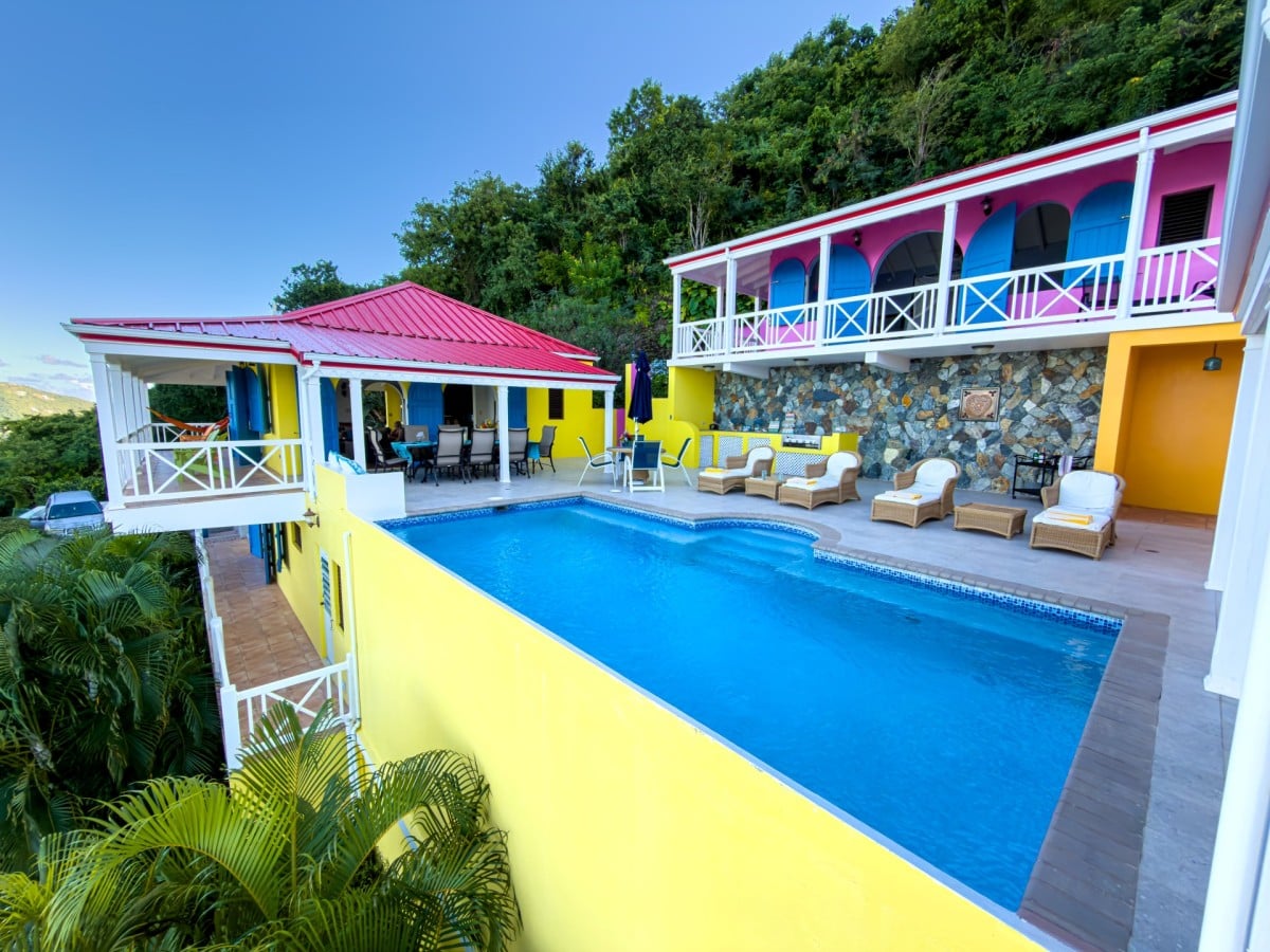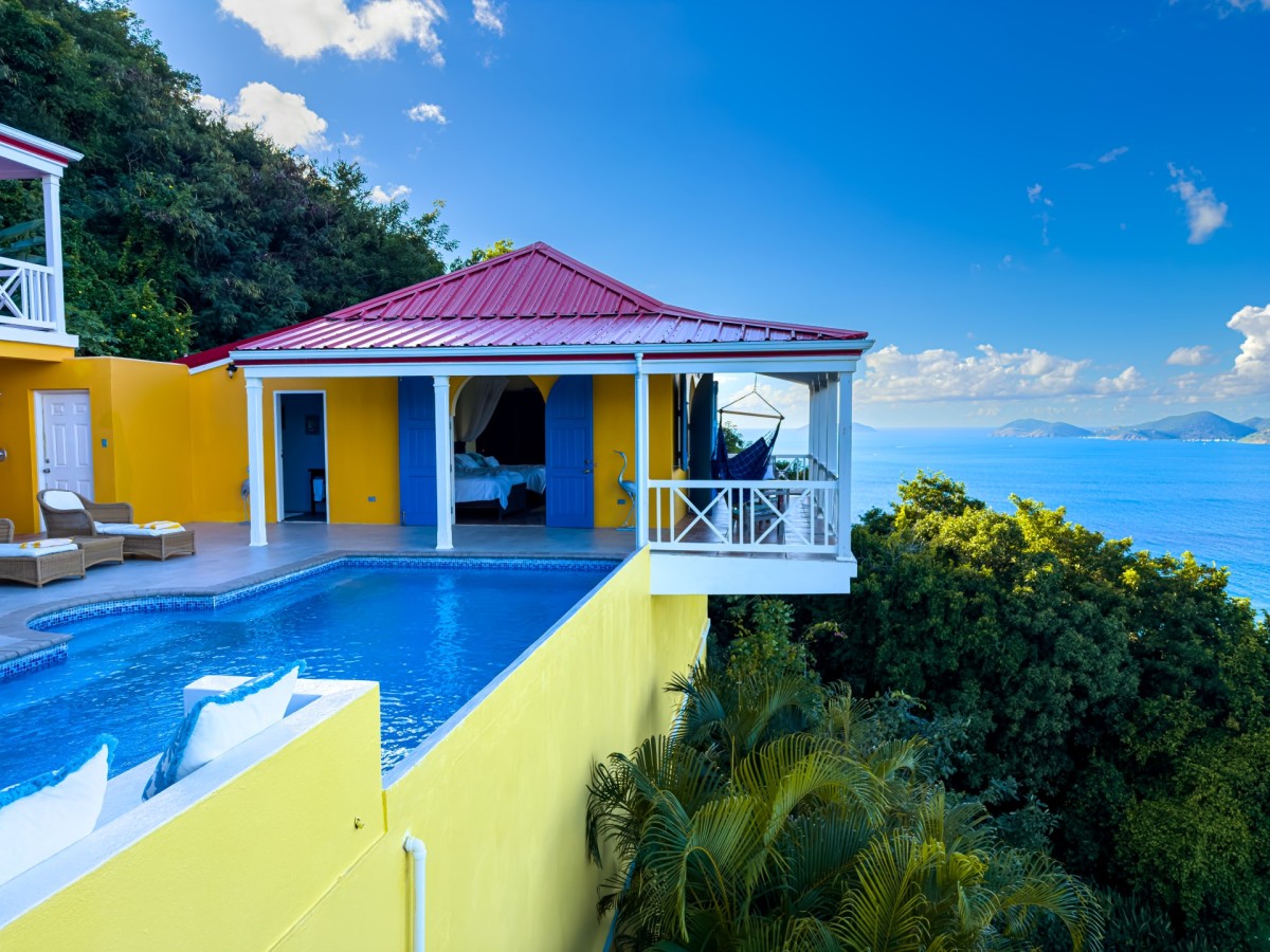 The name of this charming, three-bedroom villa is perfect, and the Villa Sunny Side Up is just as bright and cheerful as it sounds. A hillside retreat, it uses a bold and inspiring palette of sunny yellow, bright red, rich blue, and even dashes of pink to create one of the most inspiring spaces imaginable. Overlooking Long Bay Beach, in the Belmont area of Tortola, it also provides glimpses of the rolling landscape and verdant terrain that leads down to the sea.