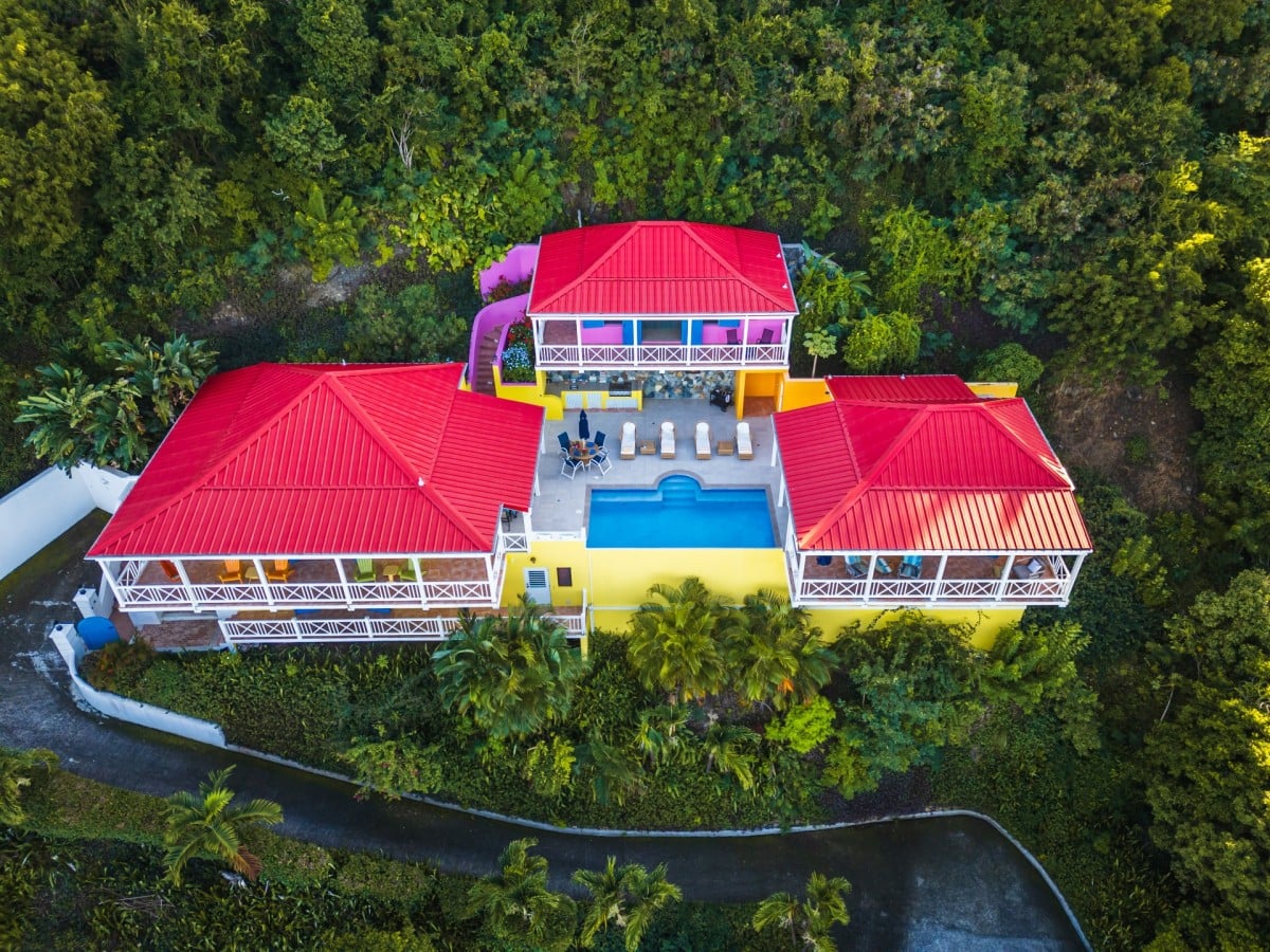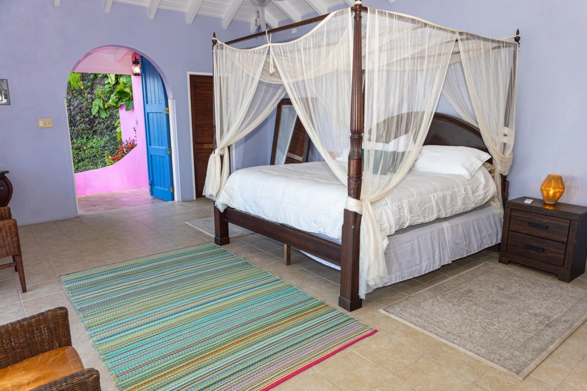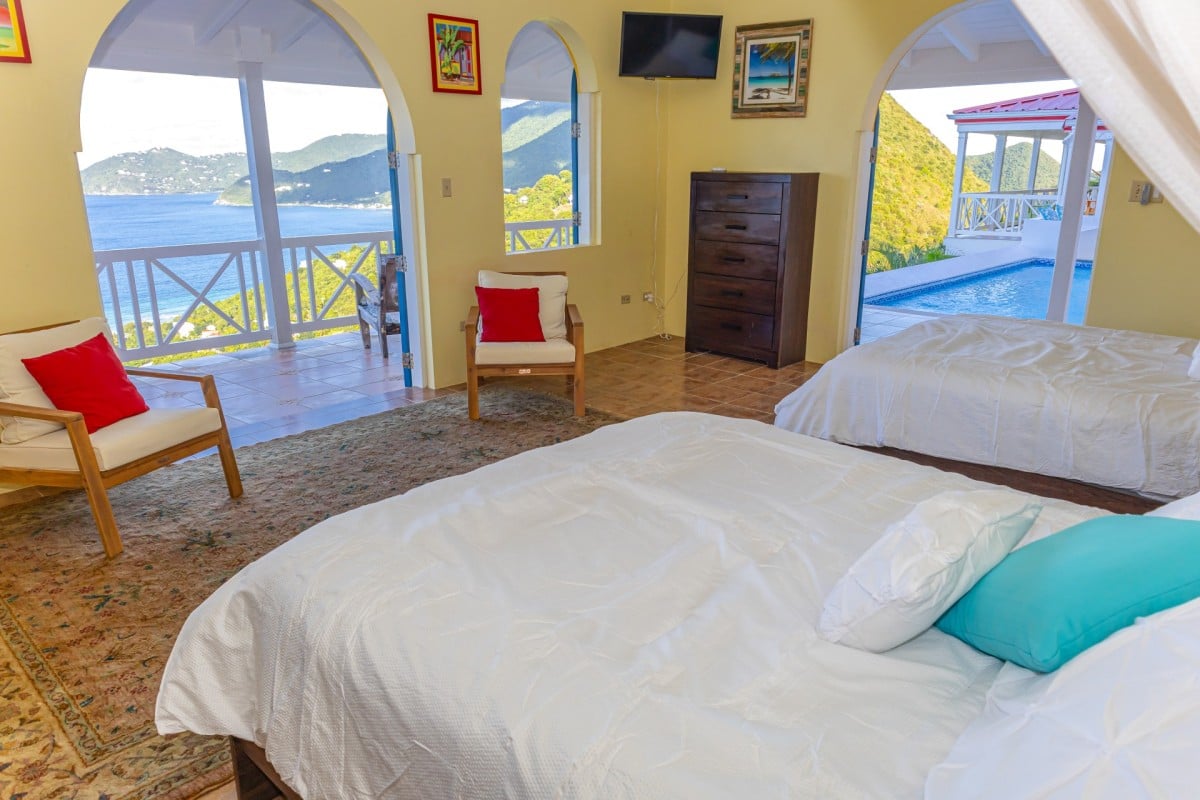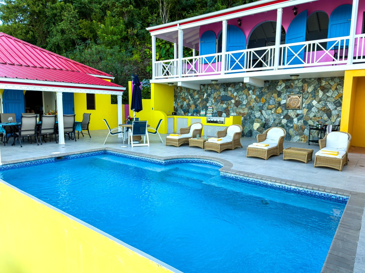 The name of this charming, three-bedroom villa is perfect, and the Villa Sunny Side Up is just as bright and cheerful as it sounds. A hillside retreat, it uses a bold and inspiring palette of sunny yellow, bright red, rich blue, and even dashes of pink to create one of the most inspiring spaces imaginable. Overlooking Long Bay Beach, in the Belmont area of Tortola, it also provides glimpses of the rolling landscape and verdant terrain that leads down to the sea.