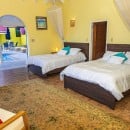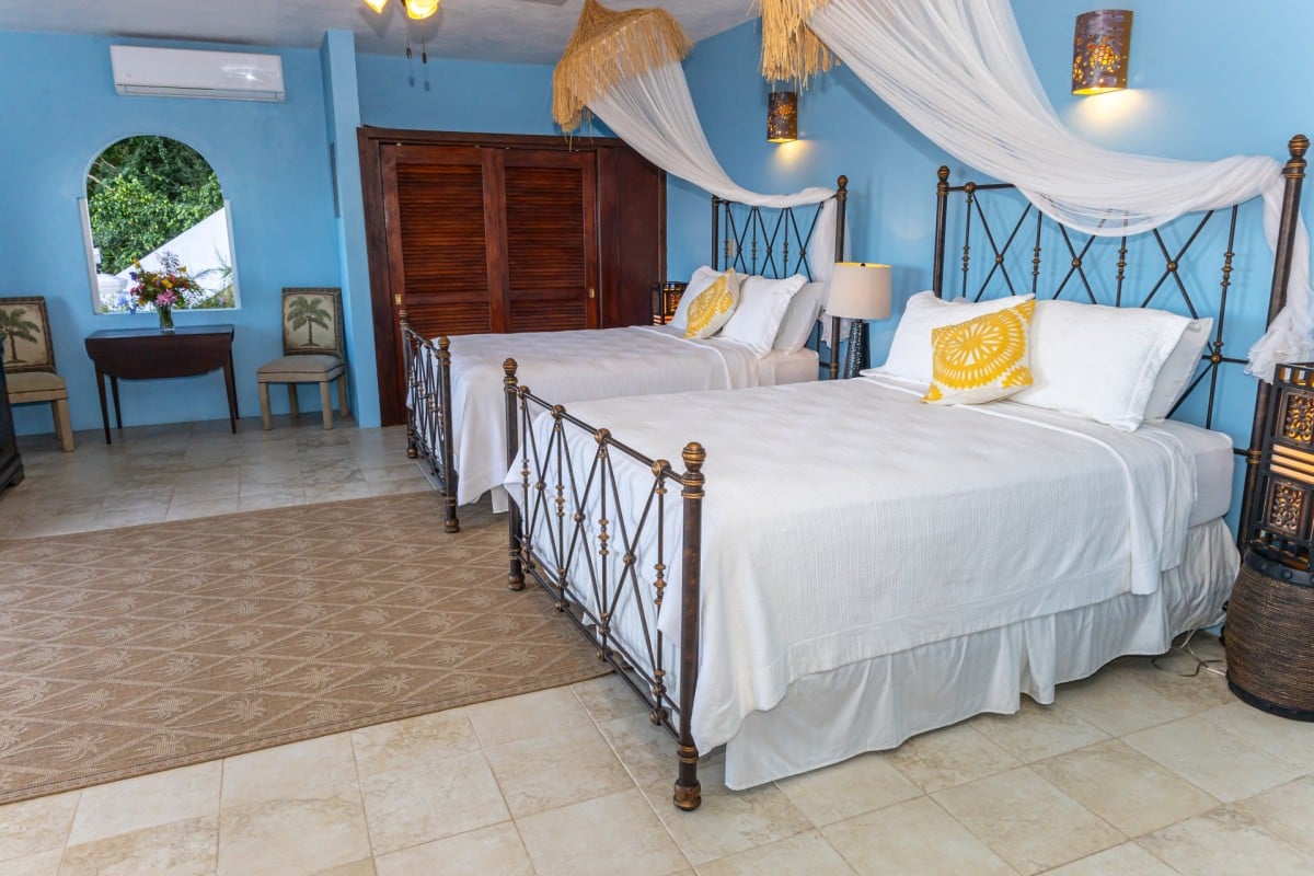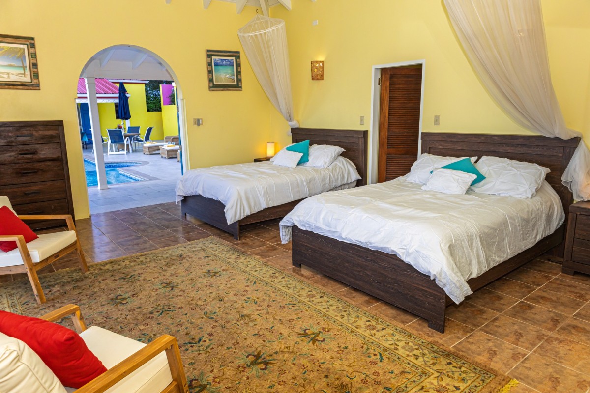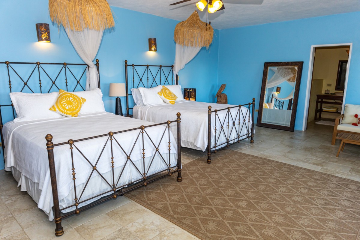 Bedroom 2: Bedroom with two queen-size beds, A/C, ceiling fan, terrace, and en-suite bathroom with shower, outdoor shower, vanity and WC. 2 guests maximum