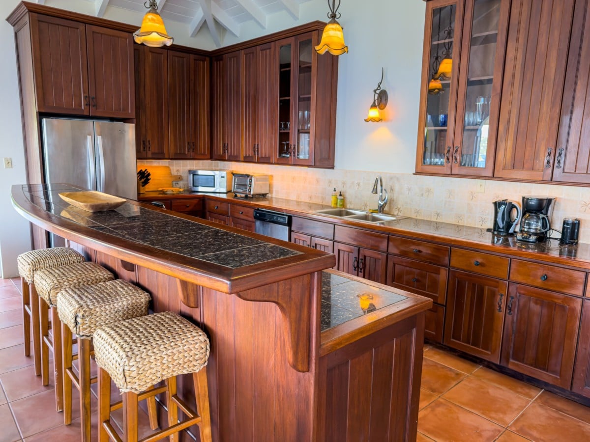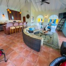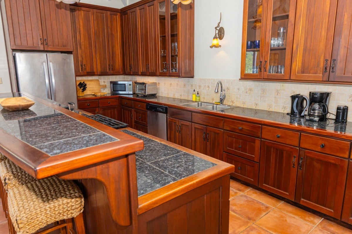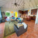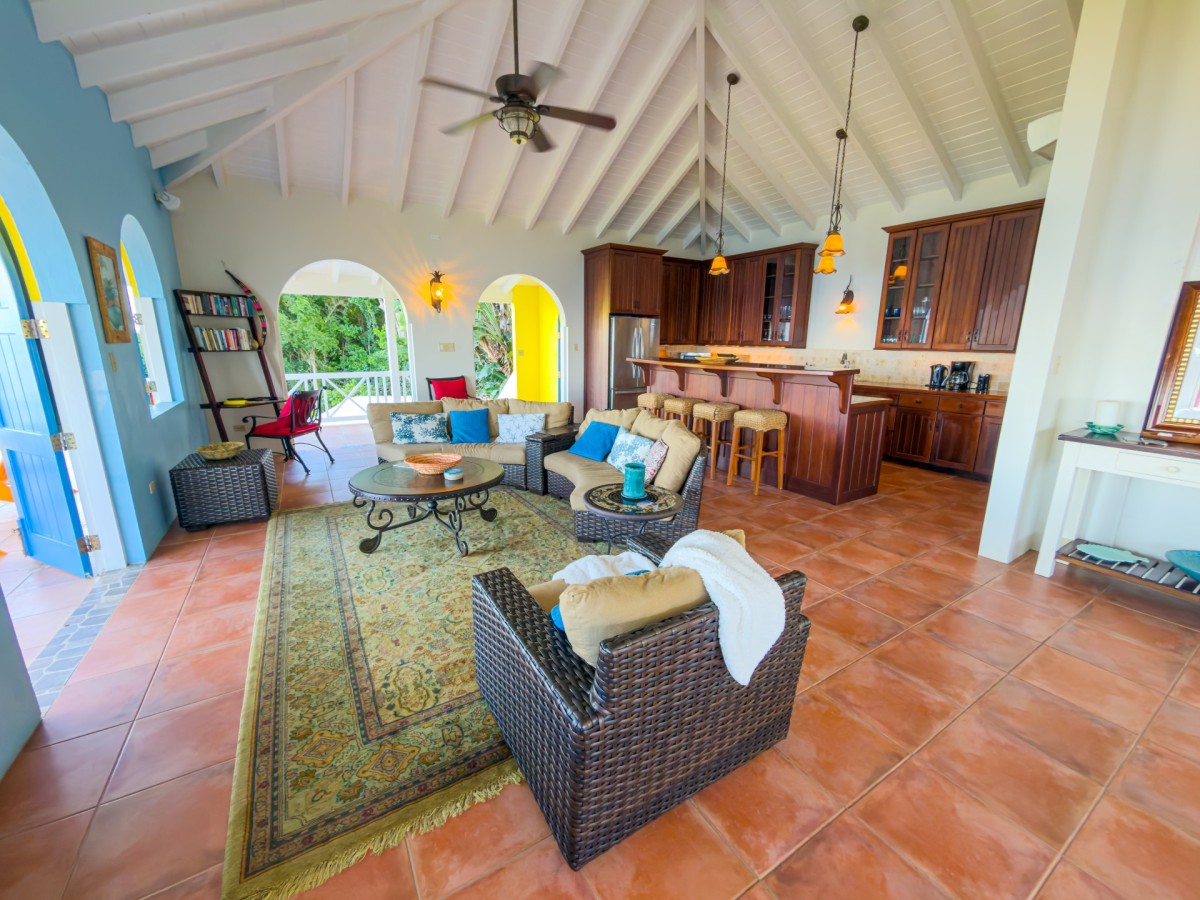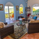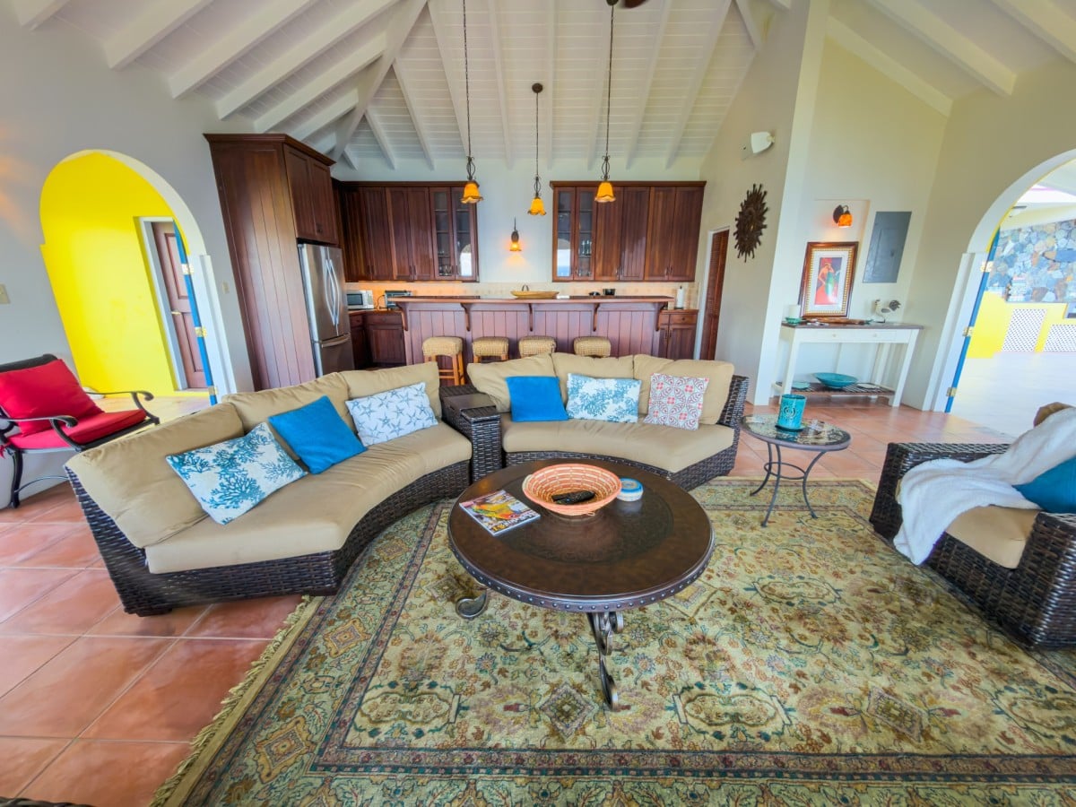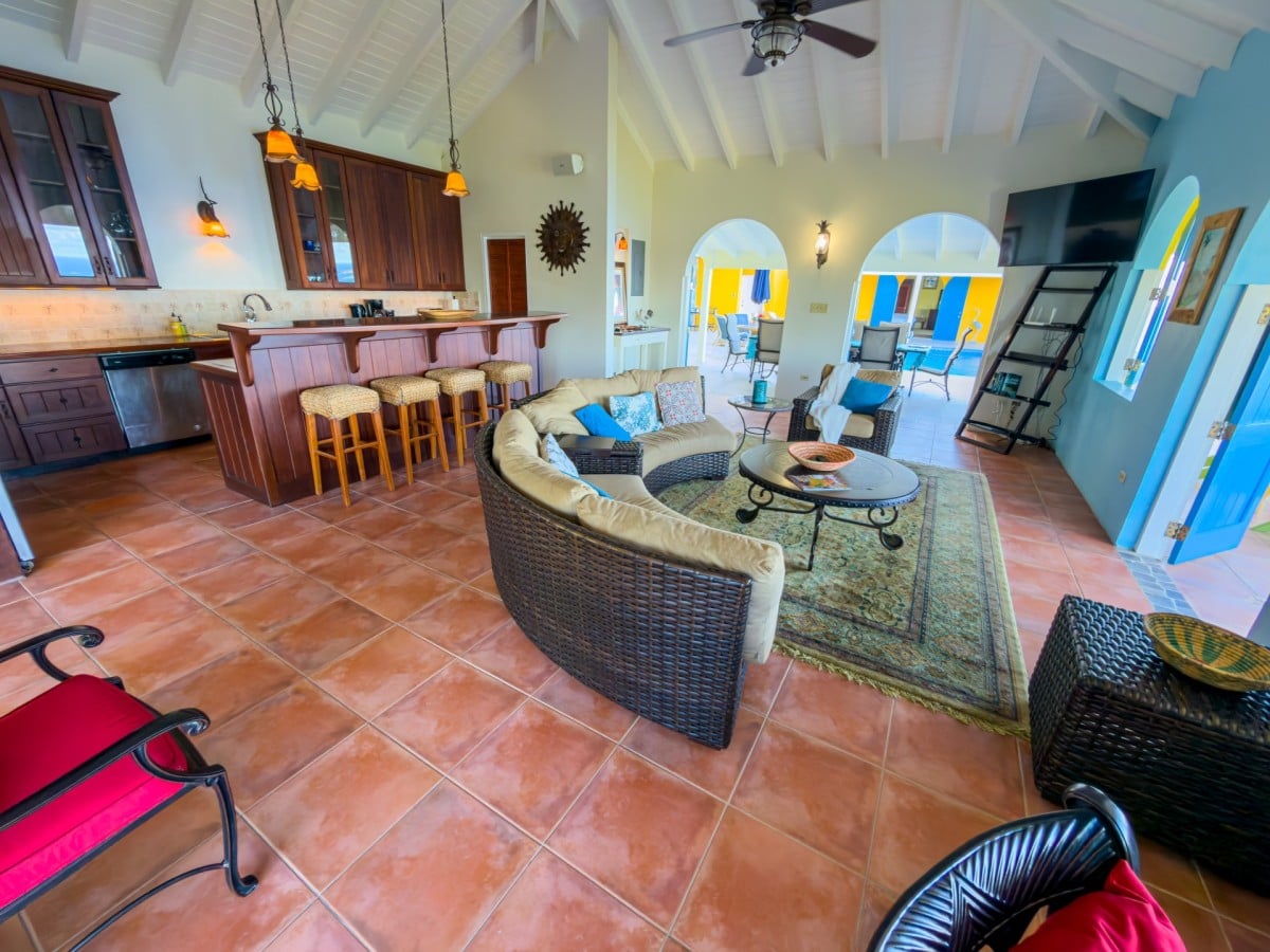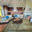 Step through the dining area and beneath the arches and you discover the great room. Just as colorful as the rest of the property, it features high ceilings and oversized furnishings spread out through the charming, open floor plan. A large living room with entertainment center faces the verandah, and behind it you find the modern and fully equipped kitchen. Suited for even a chef, it will allow you to make meals and snacks without turning away from that impressive view.
