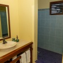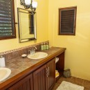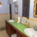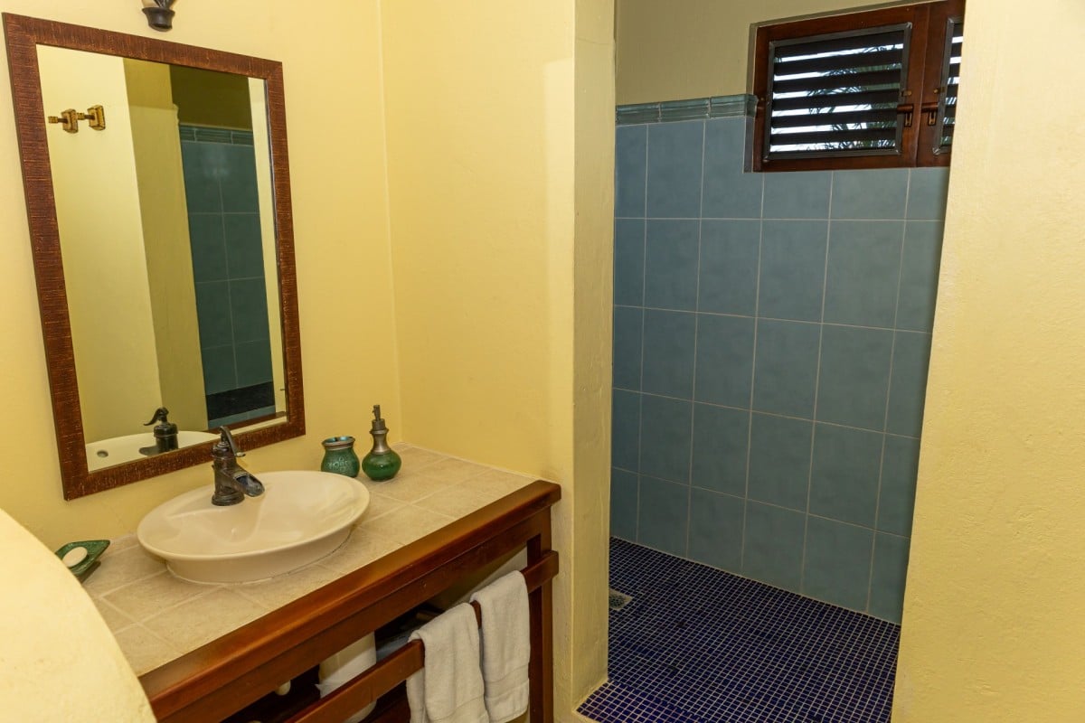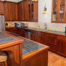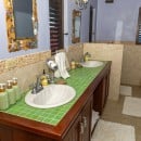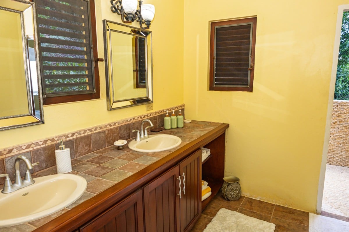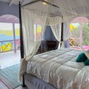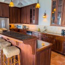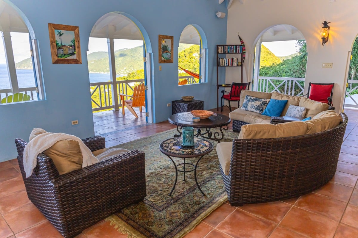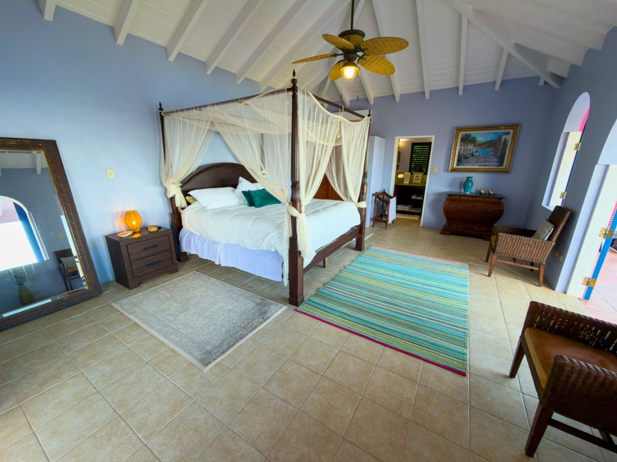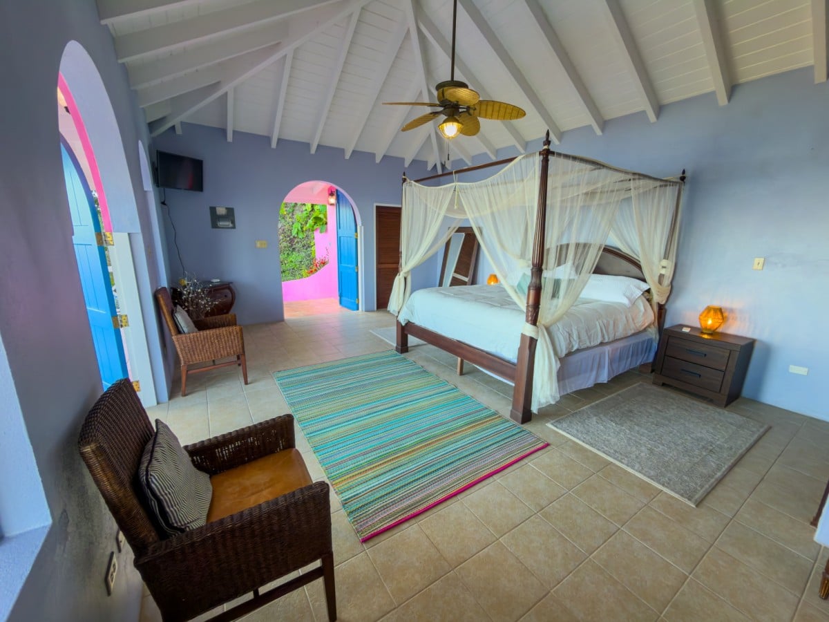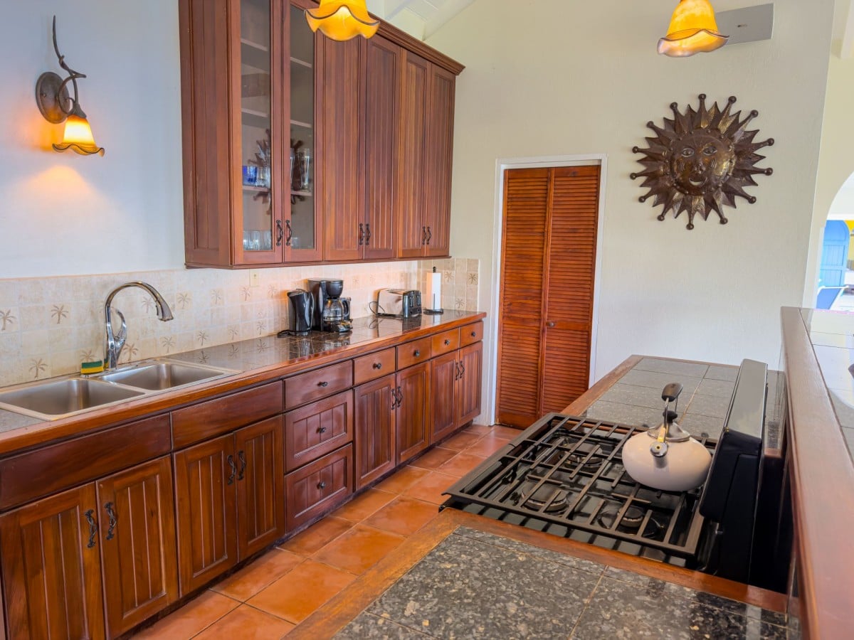 Step through the dining area and beneath the arches and you discover the great room. Just as colorful as the rest of the property, it features high ceilings and oversized furnishings spread out through the charming, open floor plan. A large living room with entertainment center faces the verandah, and behind it you find the modern and fully equipped kitchen. Suited for even a chef, it will allow you to make meals and snacks without turning away from that impressive view.