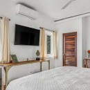 The villa's top floor is wheelchair-accessible and comprises three tastefully decorated bedrooms, adorned with wicker and antique accents. An enchanting spiral staircase descends to the ground floor, where two additional bedrooms await. Each of the five suites is generously sized and includes a king-sized bed, an en-suite bathroom, a closet, and a private balcony.