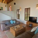 The heart of this villa is the central terrace that rests tranquilly between the two pavilion structures that contain the shared and private living spaces. The terrace features a large and lovely pool surrounded by terra cotta tiles and several sun decks. There is an al fresco dining area and barbecue here as well, and just a few steps takes you through the large arches into the lounge. Here you'll spend time on deep furnishings, taking in the view or even catching up on some TV. One of the three bedrooms is below this room.