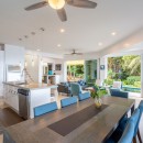The pool can also be seen from the amazing interiors on both levels. It is accessible from the main level’s oversized glass doors. The great room offers high, white ceilings and white marble floors with a definite mid-century modern look to the furnishings and décor. A trendy living room is tucked into one corner while an expansive open-air kitchen stands nearby. Stocked with the very best appliances and gear, it is the perfect place to make morning meals, midnight snacks, drinks, and more. The formal dining room also stands just inside the terrace. There is a media room for movie nights, too!
