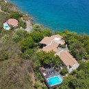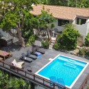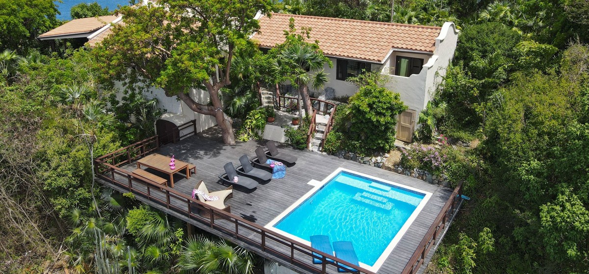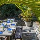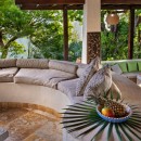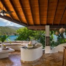 A favorite spot will be the pool area, which is a destination on its own. Walk through a garden path and down to the wooden terrace. Here you find a nicely sized plunge pool surrounded by mature palms and potted plants, and a lovely sun deck stands ready for your attention. Walk back up to the villa and you enter a lovely open-air living room with elegant, curved banquette and amazing views of the sea. This leads to yet another al fresco lounge and then up to the open-air dining room on the upper most level.