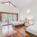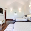 Bedroom 5: Second-floor bedroom with two queen-size beds, A/C, TV, balcony with garden view, and en-suite bathroom with bathtub, shower, vanity, and WC. 2 guests maximum