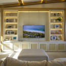 The home includes a private jacuzzi and five spacious bedrooms, each with an ensuite bathroom and walk-in closet. On the ground floor, there's a king bedroom with a Smart TV. The second floor includes two queen bedrooms, one with a Smart TV, another room with two queen beds, and a luxurious master suite featuring a custom bed and a dual full Smart TV setup.