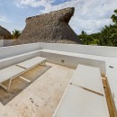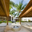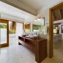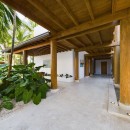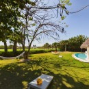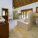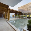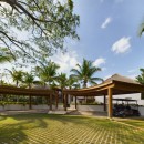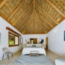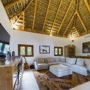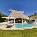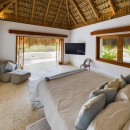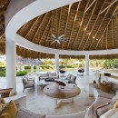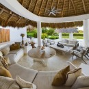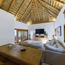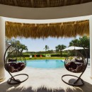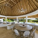The villa's design is inspired by tropical aesthetics, showcasing outdoor pavilions for both lounging and dining, all adorned with high thatched roofs and polished stone floors. The inviting wicker sofas and spacious sectionals provide ample seating for all guests. Outside, you can unwind in the private pool, soak in the hot tub, or enjoy refreshments at the swim-up bar, making your stay a truly relaxing experience.