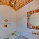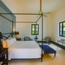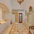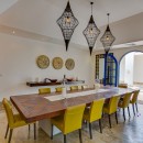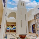 Upon entering, guests are greeted by terracotta brick vaulted ceilings, blue-framed wooden doors, and windows, guiding them through a grand entrance adorned with luxurious palms and bushes. The pathway leads to a mesmerizing display of tiled Phoenician fishes surrounding a fountain. The entrance hallways culminate in an outdoor living space, featuring rustic alfresco dining, rattan seats, and an impressive chandelier hanging over the lounge area, providing unparalleled views of the ocean and beach.