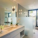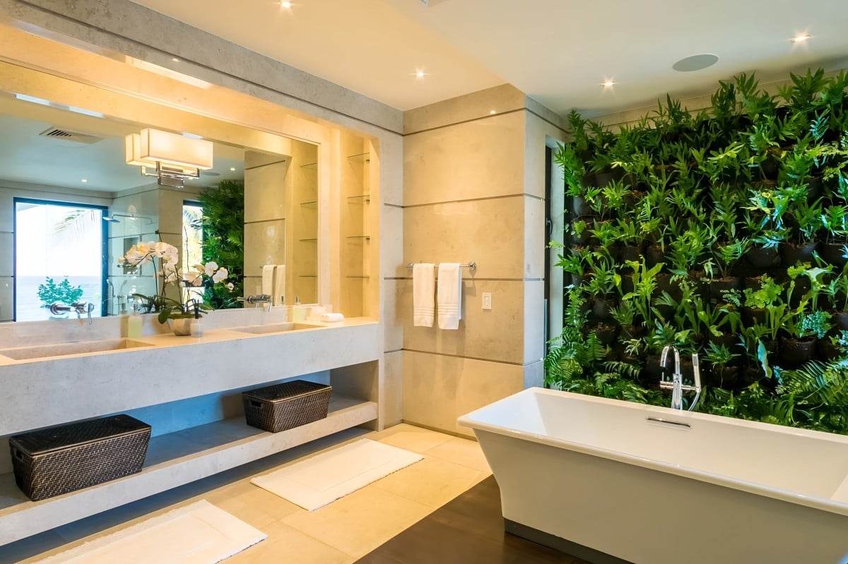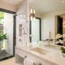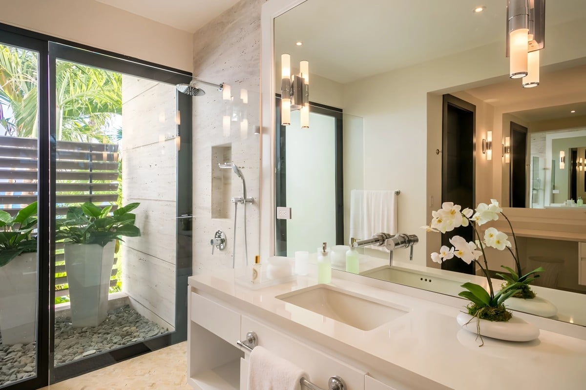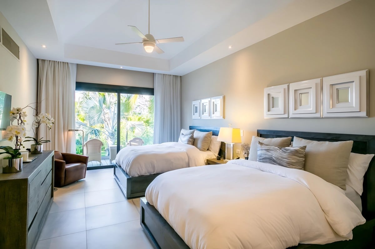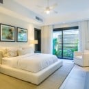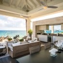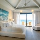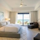 The upper level features the main suites, defined by tray ceilings, expansive sliding glass doors, and private balconies that offer panoramic views of the Caribbean Sea. Every detail is crafted to inspire comfort and tranquility, while the en-suite bathrooms include refined finishes, freestanding soaking tubs, and glass-enclosed showers reminiscent of a private spa.