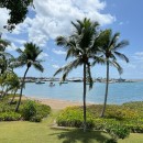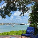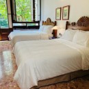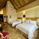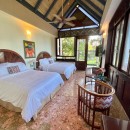 Bedroom 3: Lower floor bedroom with two queen-size beds, ceiling fan, A/C, TV, WiFi, safe, ocean view, private terrace, access to teh garden, and en-suite bathroom with shower, vanity and WC. 2 guests maximum