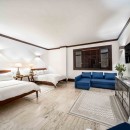 Bedroom 7: Bedroom with two queen-size beds, sofa, A/C, ceiling fan, TV, WiFi, and en-suite bathroom with shower, vanity, and WC. 2 guests maximum.