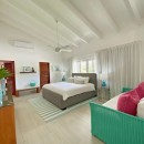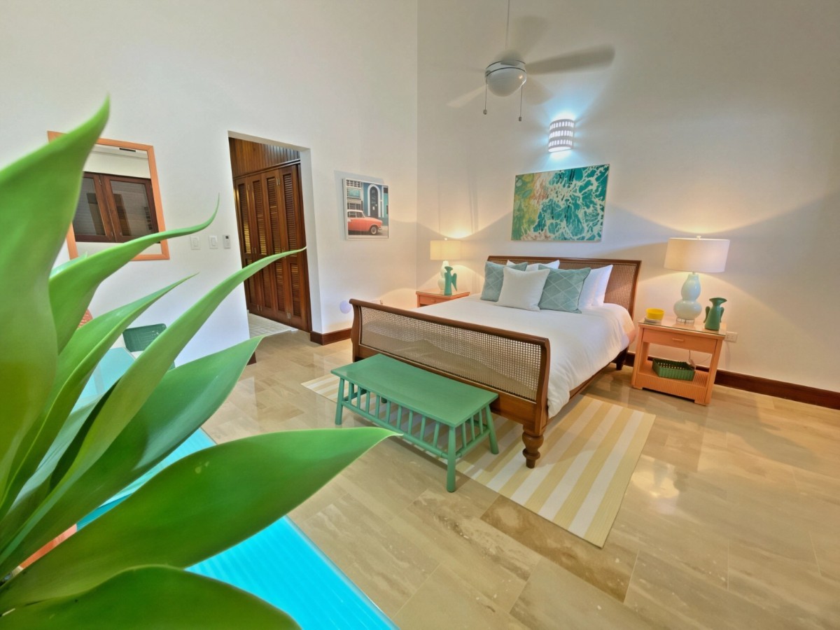Bedroom 1: Bedroom with a queen-size bed, ceiling fan, A/C, WiFi, TV, access to pool patio, and en-suite bathroom with shower, vanity and WC. 2 guests maximum.