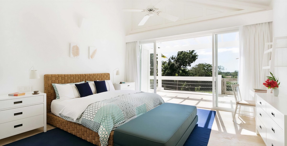 Bedroom 1: Master bedroom with a king-size bed, ceiling fan, A/C, WiFi, TV, access to pool patio, and en-suite bathroom with shower, vanity and WC. 2 guests maximum.