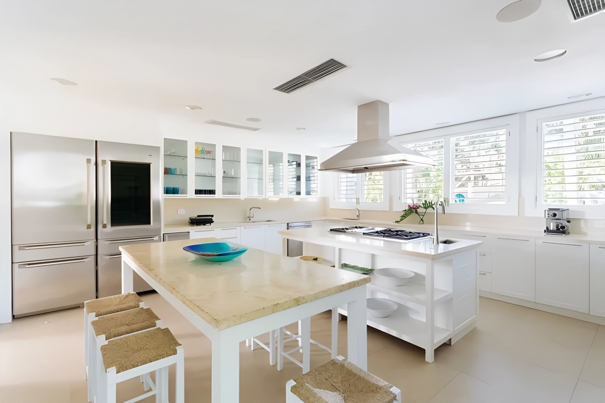 Villa Elena immediately impresses with its modern architecture, defined by clean lines and soft tones that maximize the natural light flowing through its large panoramic windows. The interiors combine elegance and functionality, featuring travertine floors, marble bathrooms, and designer furnishings that create a sophisticated yet welcoming atmosphere. The main living area is bright and spacious, opening onto a panoramic terrace with breathtaking views of the resort and lush surroundings. A fully equipped gourmet kitchen boasts high-end stainless steel appliances and premium granite countertops, perfect for creating memorable culinary experiences.