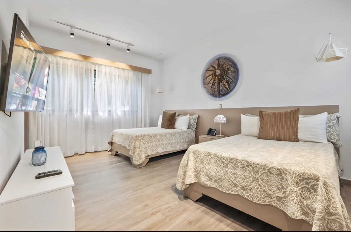 Bedroom 3: Bedroom with two king-size beds, ceiling fan, A/C, WiFi, and en-suite bathroom with shower, vanity and WC. 2 guests maximum