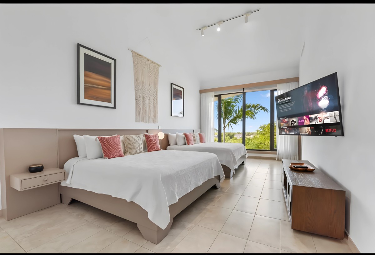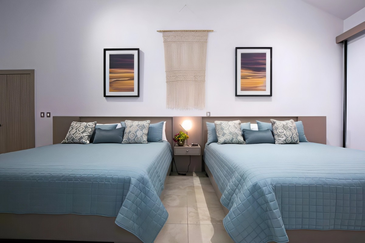 Bedroom 5: Bedroom with two queen-size beds, ceiling fan, A/C, WiFi, and en-suite bathroom with shower, vanity and WC. 2 guests maximum