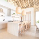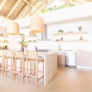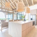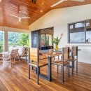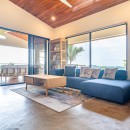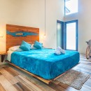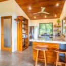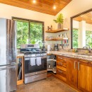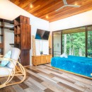 Connected to these rooms is an interior kitchen and dining area, which opens up to a floating terrace. Here, you can savor your preferred beverages while observing monkeys and toucans in the treetops of the forest, or watch the sun as it sets over the glistening ocean in the distance.