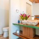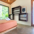 The guesthouse presents a primary bedroom containing a queen-size bed and its entrance. It boasts an en-suite bathroom equipped with an outdoor shower, along with a private terrace dedicated to yoga activities. This room is also furnished with a smart TV, air conditioning, a ceiling fan, a computer desk, and WiFi, and offers picturesque views of the surrounding jungle. Additionally, there are two more guest rooms, each furnished with a queen-size bed, air conditioning, ceiling fan, WiFi, and scenic jungle views. These rooms share access to a communal bathroom.