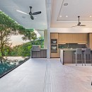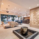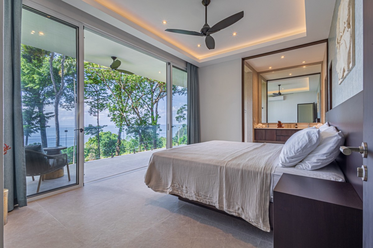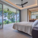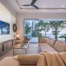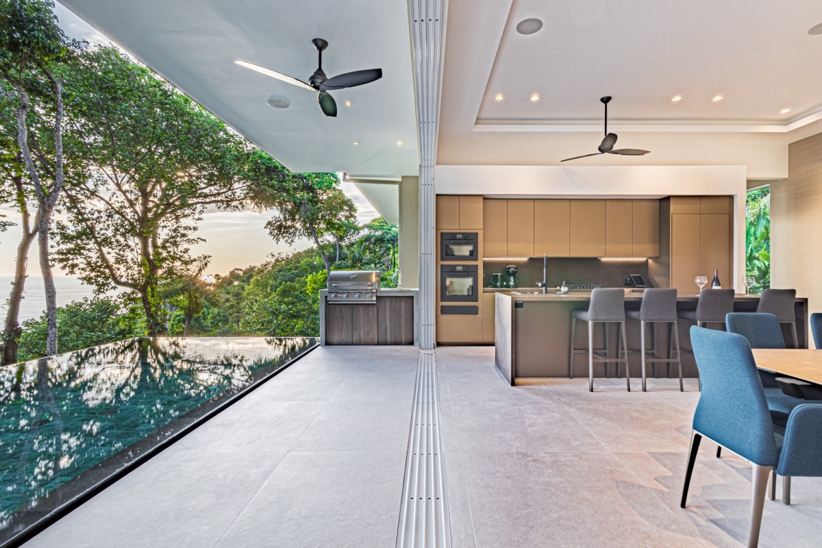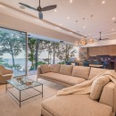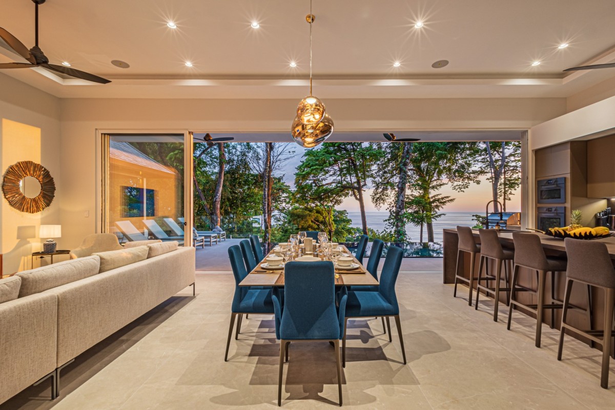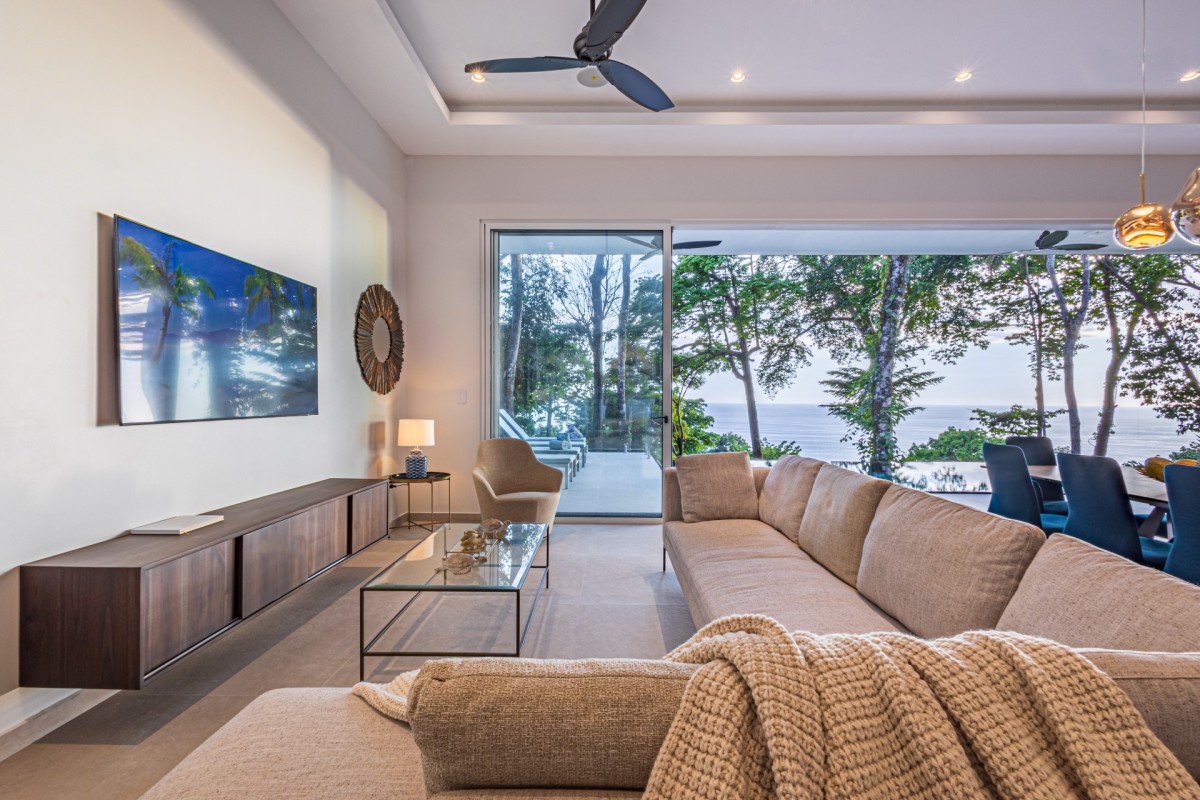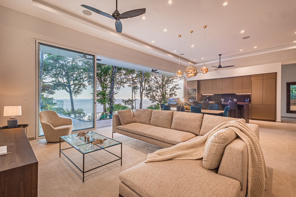 The open-plan living area features minimalist designer furnishings and expansive glass doors that blur the line between indoors and outdoors, framing uninterrupted jungle and ocean vistas from every angle.