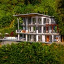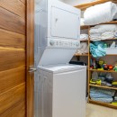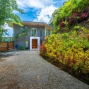 The master bedroom occupies the top level, offering complete panoramic views of the rainforest and ocean. This large, secluded suite includes an ensuite bathroom with double sinks, a pebble floor shower with a rain head fixture, and frameless glass. It also boasts a spacious walk-in closet with custom teak shelving. Enjoy your morning coffee overlooking the ocean from your private covered deck or indoors from the bistro table or chaise lounge. The room includes a 50" TV, blackout shades, and a small deck with glass French doors overlooking the front drive.