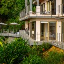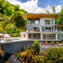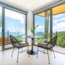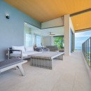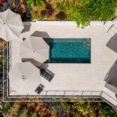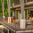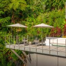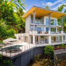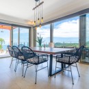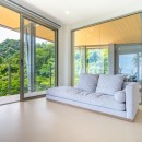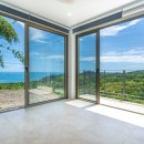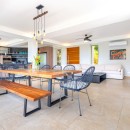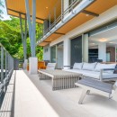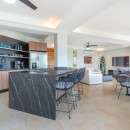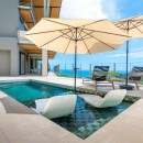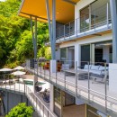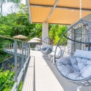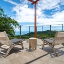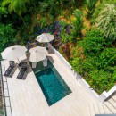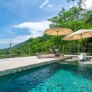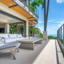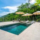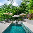 The other three bedrooms are located on the bottom floor, each with panoramic views of the rainforest and ocean, blackout shades, and outdoor decking with seating. All downstairs bedrooms have access to the pool. The pool deck is expansive, featuring a Bali stone pool, splash deck, in-pool bench seating, regular seating, lounge chairs, in-pool loungers, and multiple umbrellas.