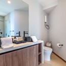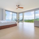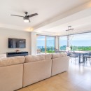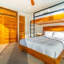 Bedroom #2 has a queen-size bed, an ensuite bath, a covered balcony with hanging Bali chairs, a walk-in closet, and blackout shades. Bedroom #3 is very large, with a king-size bed, wrap-around views, a balcony, and blackout shades. Bedroom #4 includes a queen-size bed with a single bed above it, making it an excellent space for children or families. It also features a balcony, wrap-around views, and blackout shades. Bedrooms #3 and #4 share a generous bathroom with a large double vanity and walk-in shower.