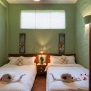 Bedroom 5: Ground floor bedroom with two queen-size beds, TV, A/C, ceiling fan and shared bathroom (with bedroom 6) with shower, vanity and WC. 2 guests maximum.