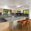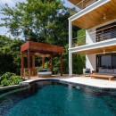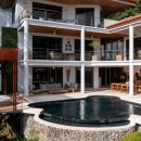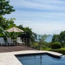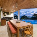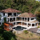 Casa Anjali's distinctive architectural design seamlessly integrates with its natural surroundings, offering unforgettable vistas that set it apart as a unique villa rental in Costa Rica. Spanning 6,000 square feet of interior space and featuring an additional 3,000 square feet of decked terraces across three floors, this villa boasts a glass tower stairwell, lofty vaulted teak ceilings, and striking nine-foot-tall folding window walls. These windows reveal breathtaking panoramas of Manuel Antonio's coastline and rainforest.