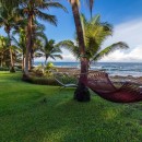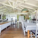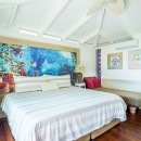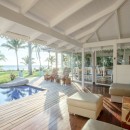 The villa’s design exudes charm and elegance, featuring gingerbread trim, beamed ceilings, white beadboard walls, and rich dark wood floors. Expansive floor-to-ceiling windows flood the space with natural light and offer uninterrupted ocean views. The living room’s sleek white leather sectionals provide ample seating, while vibrant artwork adds a tropical flair. In the dining area, carved white chairs with striped cushions create a relaxed beachside ambiance, complemented by a glass wall that opens to invite in the fresh sea breeze. The fully equipped kitchen combines warm wood cabinetry with modern stainless steel appliances and beadboard ceilings for a touch of coastal sophistication.