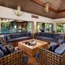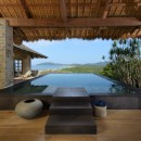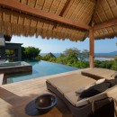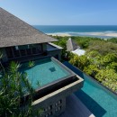 The interior of Casa Alang Alang features a spacious living area with a large ironwood dining table and a cozy sofa, all framed by spectacular ocean views. The villa also offers two exquisite swimming pools: a 21-meter lap pool that flows into a serene Bale with double loungers, and a stunning main pool that overflows on all sides, creating a breathtaking mirror effect against the backdrop of the ocean.
