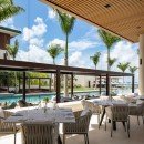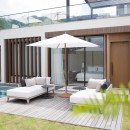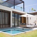 The main level of the villa showcases both indoor and outdoor living and dining areas, accommodating up to ten people. Here, you'll find a fully equipped kitchen and a convenient guest powder room. Step outside onto the outdoor patio, where a magnificent 50-meter swimming pool awaits. The patio also features comfortable lounging areas, a dining table for ten, and unobstructed vistas of the ocean, inviting you to relax and soak in the beauty of your surroundings.