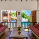The main living area in this villa is spacious and comfortable. It has an open lounge area, a dining area, and a well-equipped kitchen. Guests can also eat and have cocktails outside on the covered terrace. The outdoor area also offers nooks for lounging and exceptional views of the water.