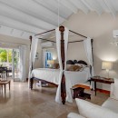 Bedroom 6 - White Room: Downstairs bedroom with a king-size bed, TV, VCR access to verandah and pool terrace and en-suite bathroom with bathtub/shower combination, vanity and WC. 2 guests maximum.