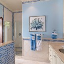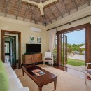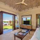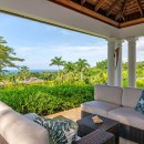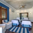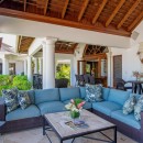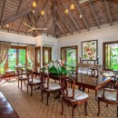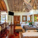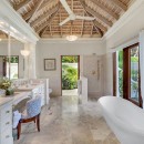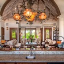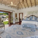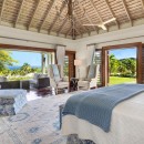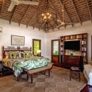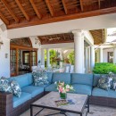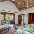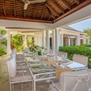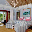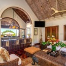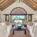 The interior of this Montego Bay luxury villa is furnished in a medley of off whites and beiges, and accented with upbeat island colors of green and orange. The décor is enhanced by the rich wood of the parquet flooring, furniture and trim. A beautiful wood bar in the heart of the villa sets the tone for a carefree tropical vacation. Access the bar from the living room, family room and outdoor areas. A wide Palladian doorway frames gorgeous pool and sea views from the living room. Enter the formal dining room through a graceful archway flanked by decorative columns, and enjoy spectacular seascapes as you dine.