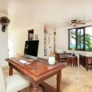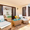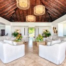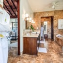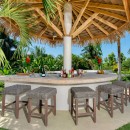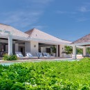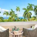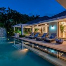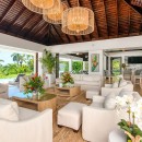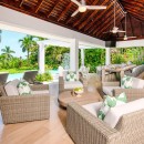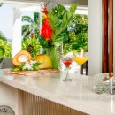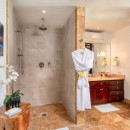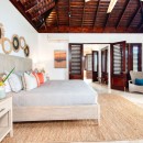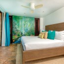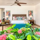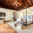 The villa boasts a total of five bedrooms, with two on the main floor and three below. Four bedrooms feature king-size beds and en-suite bathrooms with double sinks and spacious walk-in showers, while one includes two queen beds. Three bedrooms boast private verandas, one opens onto the pool deck, and the fifth is nestled behind a magnificent waterfall.