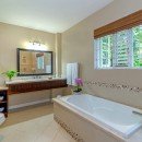 Two of the bedroom suites at Frangipani at Prospect Estate are in the East Wing and include a dressing area, an ensuite bathroom, king-sized beds, and French doors that go out to the spacious verandah. The other two bedrooms have the same amenities but are located in the West Wing. All of the bedrooms come with extras such as large closets, flatscreen televisions, personal safes, and robes and slippers.
