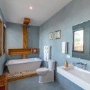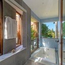 Bedroom 5 - East Wing: Ground floor bedroom with a king-size bed, A/C, ceiling fan, TV, access to the terrace, sea views and en-suite bathroom with bathtub, shower, double vanity and WC. 2 guests maximum.