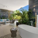 Bedroom 5: Ground floor bedroom with a king-size bed, ceiling fan, A/C, TV, WiFi, safe, private garden with bathtub, and en-suite bathroom with shower, vanity and WC. 2 guests maximum.