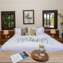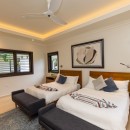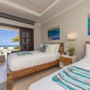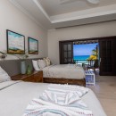 Bedroom 4: Upper-floor bedroom with two queen size beds, A/C, ceiling fan, TV, walk-in wardrobe, ocean view, balcony, and en-suite bathroom with walk-in shower, vanity, and WC. 2 guests maximum