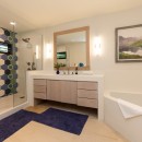 Bedroom 2: Lower floor bedroom with two queen size beds, A/C, ceiling fan, TV, walk-in wardrobe, ocean view, terrace, and en-suite bathroom with bathtub, shower, double vanity, and WC. 2 guests maximum