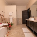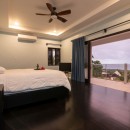 Bedroom 1: Top-floor Master bedroom with a king-size bed, A/C, ceiling fan, TV, access to balcony with ocean and golf course views, and en-suite bathroom with double shower, spa tub, vanity and WC. 2 guests maximum