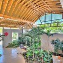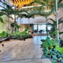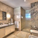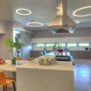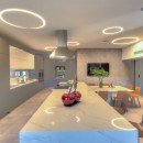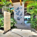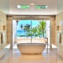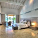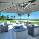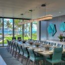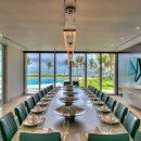 Once you step inside, you can take advantage of an elegant main foyer with coralina stones and marble floor tiles that leads right into the living room. This space offers high ceilings and wooden beams surrounded by Caribbean vegetation and evergreen palms. Guests can look out over the blue ocean while making use of rattan chairs, couches, and other sitting spots in a relaxing environment. Those who head outside can hang out by the large pool, take a dip in the hot tub, or look out at the sea. There are numerous living areas outside where you can take in the tropical breeze. The dining room is next to the living room and has a table with space for 22 guests along with other elegant décor. Your eyes will catch on the outdoor views and extra light is provided through a modern chandelier.