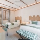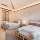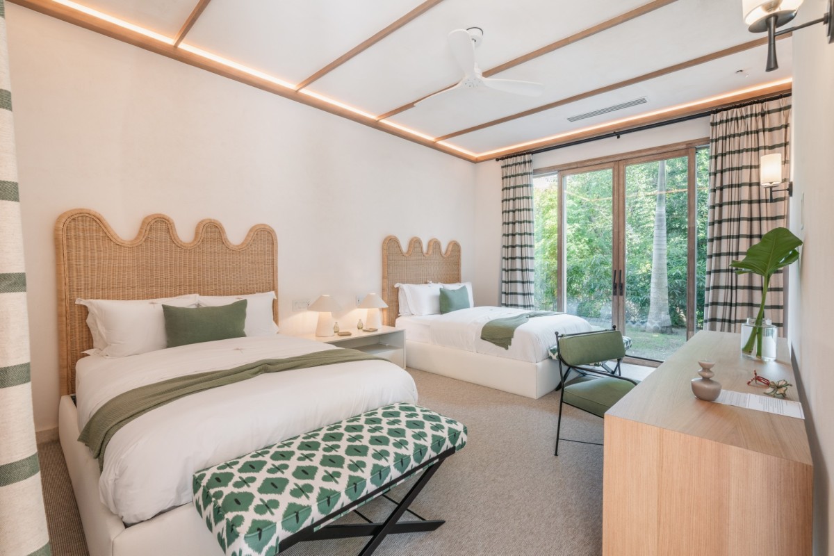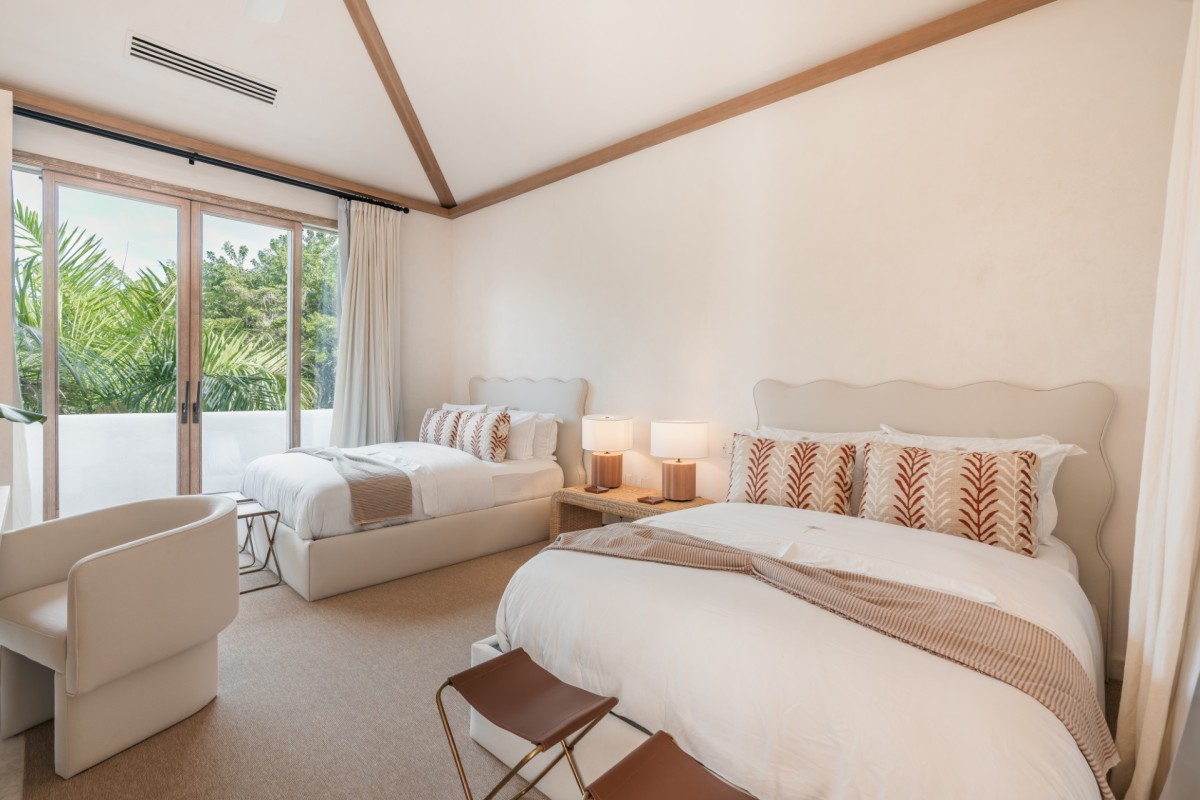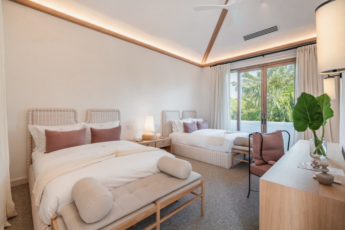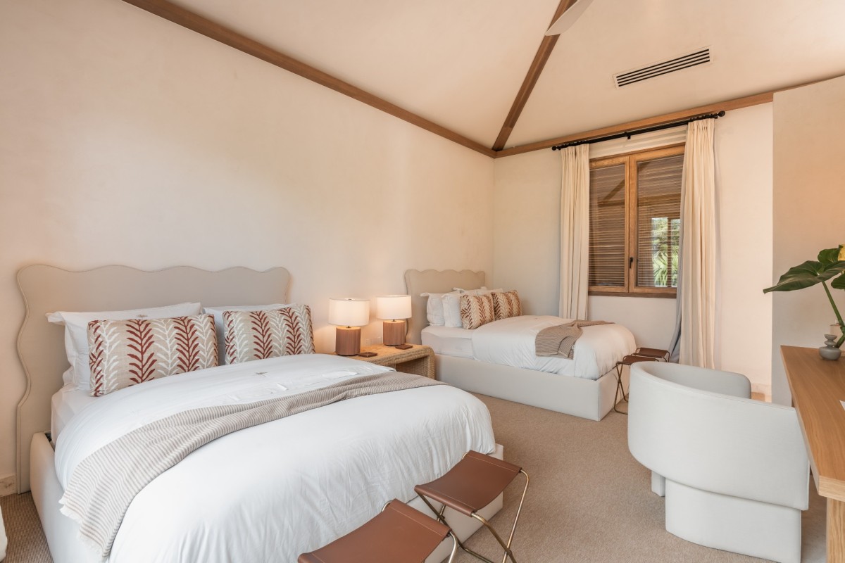 Bedroom 5: Second floor bedroom with two queen-size beds, ceiling fan, A/C, WiFi, and en-suite bathroom with shower, vanity and WC. 2 guests maximum.