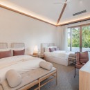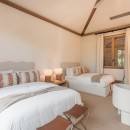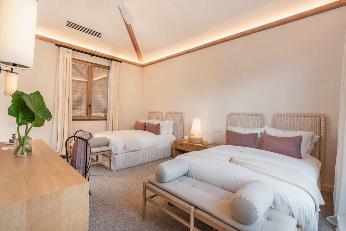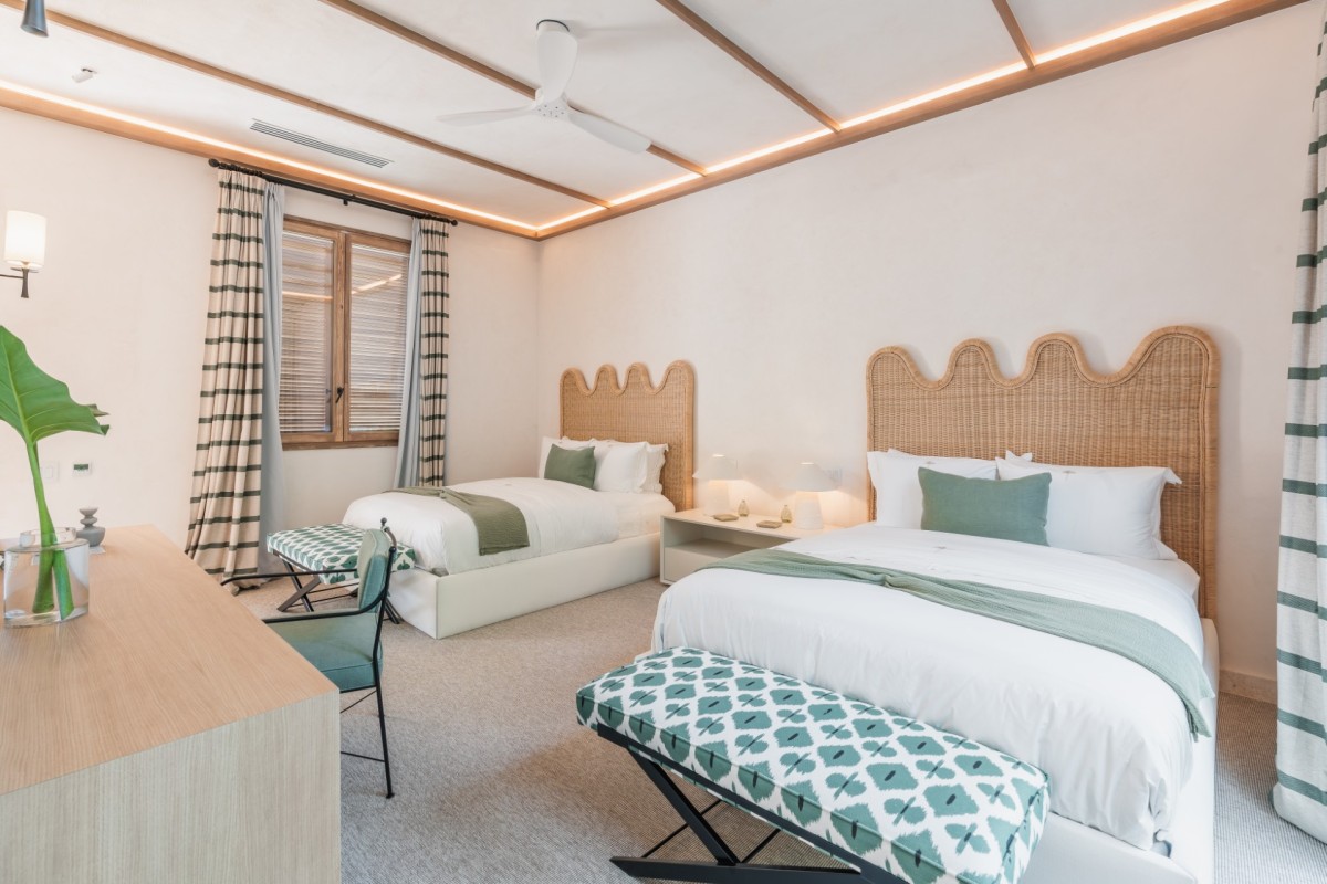 Bedroom 6: Ground floor bedroom with two queen-size beds, ceiling fan, A/C, WiFi, and en-suite bathroom with shower, vanity and WC. 2 guests maximum.