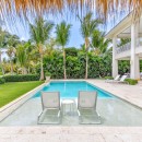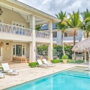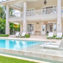 The lawns surrounded the creamy white facade of the home is meticulously cared for and are dotted with palm trees and other tropical shrubs. The crystal clear waters of the pool will keep you refreshed while you spend your afternoons lazing on one of the pool loungers. The covered pavilion provides a place to enjoy your morning coffee or dine al fresco. You will love spending the evening sipping a glass of wine from the patio or balcony.