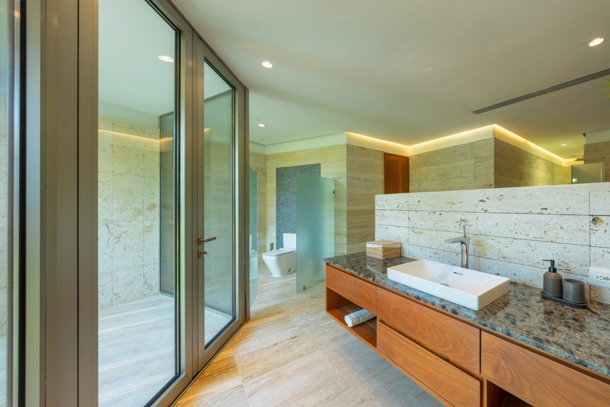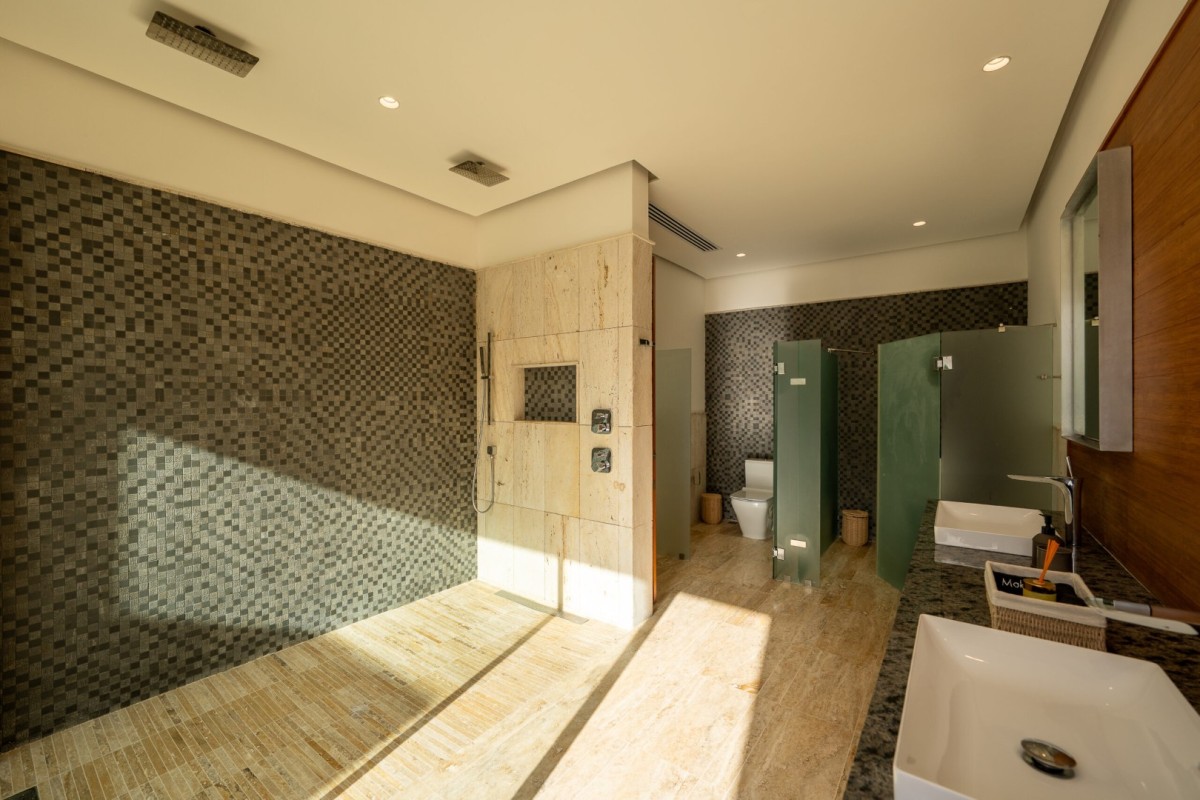 The interiors are nothing short of spectacular. Elegant and modern, the villa features a formal dining room, a state-of-the-art gourmet kitchen, and an inviting living room designed for both style and comfort. Each of the six bedrooms offers a private oasis, complete with double beds, luxurious en-suite bathrooms, entertainment systems, and access to sea views or garden terraces.