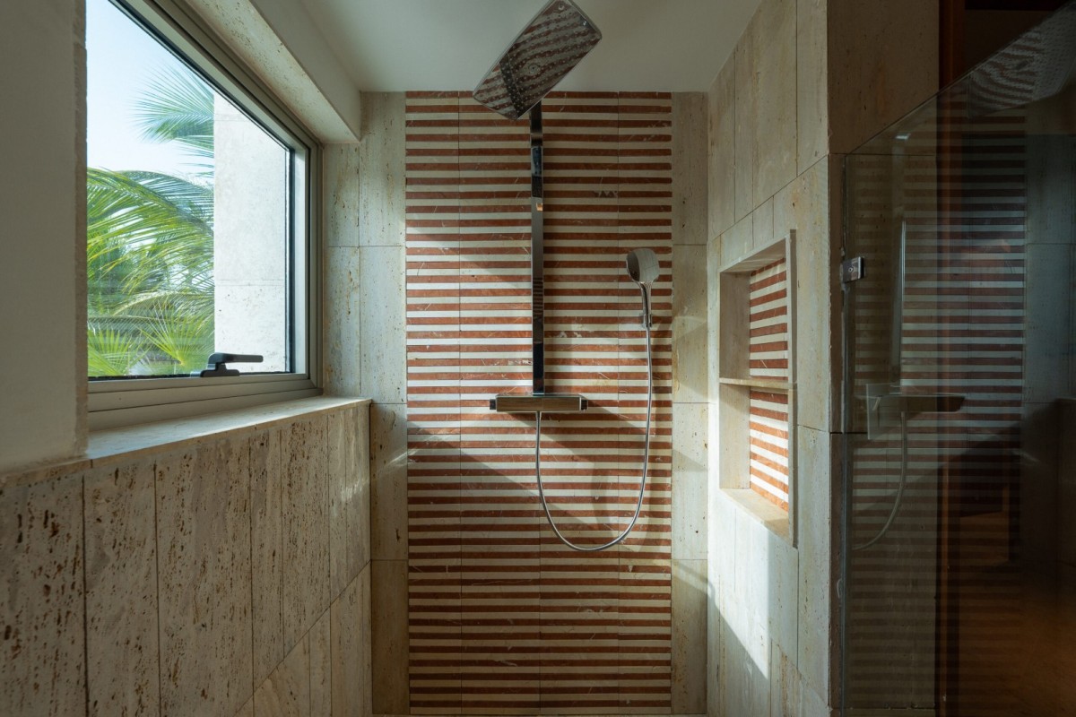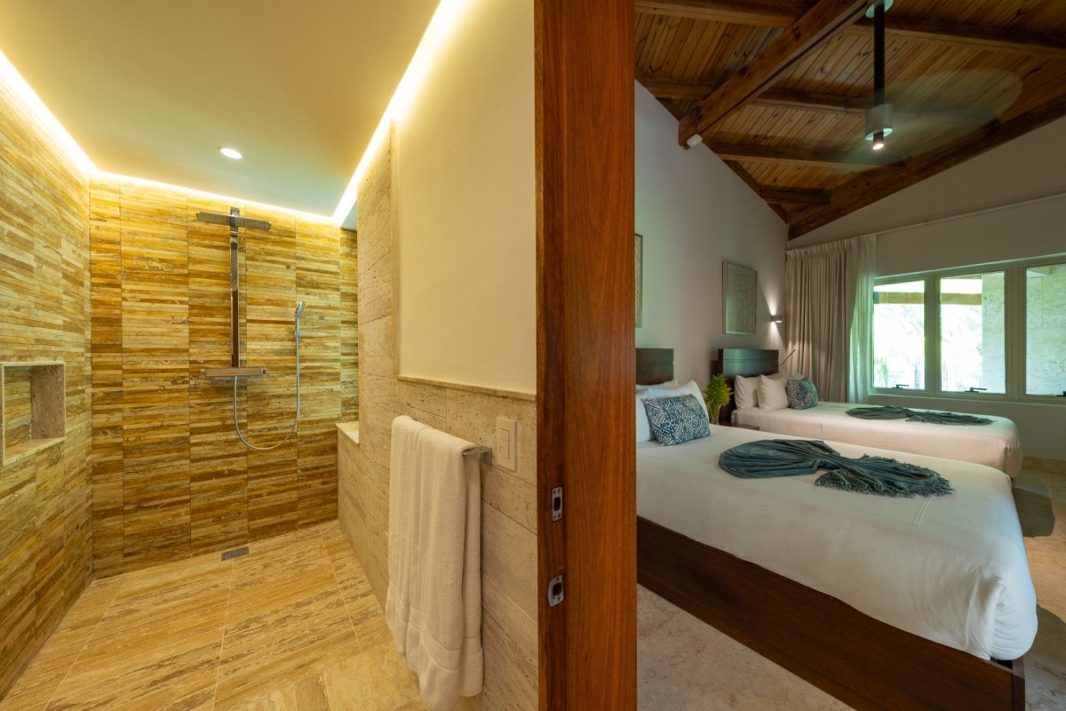Bedroom 2: First floor bedroom with two double beds, A/C, WiFi, TV, walk-in closet, private terrace, and en-suite bathroom with shower, vanity and WC. 2 guests maximum