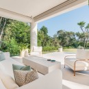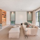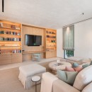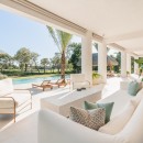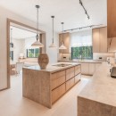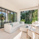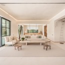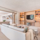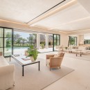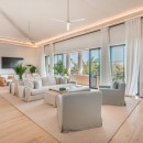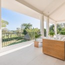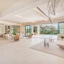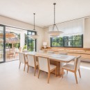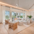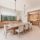 The spacious living room opens seamlessly onto an expansive terrace with stunning views of the golf course, perfect for unwinding and taking in the natural beauty. Adjacent to the living area, the dining room features a large table that comfortably seats eight, ideal for shared meals and special gatherings. The fully equipped kitchen boasts high-end appliances and a breakfast bar, making it perfect for casual dining or a quick morning coffee.