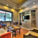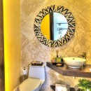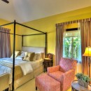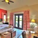 When you do venture inside, you will find an eclectically decorated space full of safari and Morrocan accents. The large dining table with rattan dining chairs will seat your entire party for your larger family meals. The lovely kitchen with Moroccan tile backsplash if fully equipped with a gas stove and large stainless steel refrigerator. There is also a small media room with workspace if you need to get away from the crowd and answer some phone calls or emails.